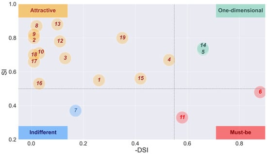 Finally, Satisfaction Influence (SI) coefficients and Dissatisfaction Influence (DSI) coefficients are calculated to visualize the analysis results on the coordinate axis []. The SI and DSI coefficients are computed using better and worse values [].