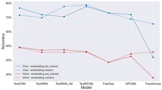 The text classification tool developed in this study was implemented with the help of an open-source Chinese text classification project based on the PyTorch framework, which can be found at github.com/649453932/Chinese-Text-Classification-Pytorch (accessed on 3 March 2023). This project achieved excellent results on a news headline classification dataset of 200,000 samples []. In this study, we replaced the news headline dataset with two datasets obtained from the previous step of preprocessing and labeling. We trained and tested seven deep-learning models on these datasets, including TextCNN, TextRNN, TextRNN_Att, TextRCNN, FastText, DPCNN, and Transformer. Each model can be trained using either randomly initialized or pre-trained word embeddings. We obtained 28 (7 models × 2 datasets × 2 embeddings method) classification accuracies.