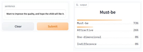 We developed an interactive text classification tool to facilitate a more intuitive use of our text classification models. This tool uses the Python gradio library, allowing users to input text and obtain predicted probabilities for each of the four classes (see Figure 6). The user-friendly interface, depicted in Figure 7, is clean and straightforward, negating the need for prior training. The interface features a large input area on the left, where users can enter texts of varying lengths for analysis. The tool swiftly processes the text and presents the classification results upon submission. The output includes the identified category of user needs per the Kano model and the respective probability scores, all in a simple, digestible format. In the development process, we used the TextRCNN model with randomly initialized word embeddings as the basis and integrated this model into our interactive tool []. The tool automatically preprocesses the user input and utilizes the trained model for classification. Through this tool, users can gain a more intuitive understanding of the effectiveness of text classification. We believe an interactive tool will positively impact the promotion and application of text classification models and help more users, especially beginners, make informed decisions when classifying user needs.