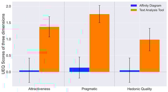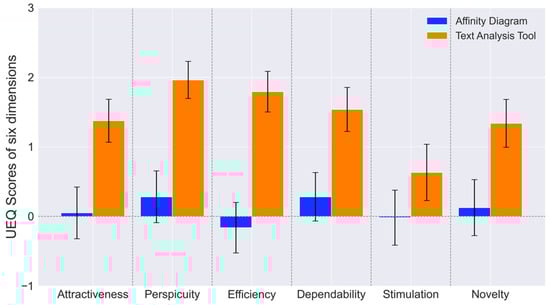 Table 5 shows the mean and standard deviation of the UEQ scores across each dimension. The UEQ scores range from −3 to 3, with higher scores indicating better performance in the respective dimension. The text analysis tool outperformed the affinity diagram method across all six dimensions, reflected by its higher average scores. This result suggests that the text analysis tool offers superior user experience compared to the conventional affinity diagram approach.