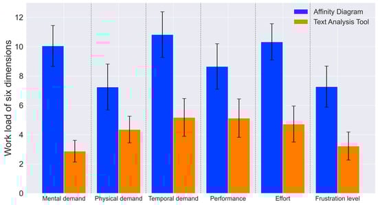 Table 7 shows the mean and standard deviation of the NASA-TLX scores, including one overall score and scores on six different dimensions. The calculation formula for the overall score is presented as Equation (3). It is evident that the workloads, both in the six dimensions and overall, are lower for the text analysis tool compared to that for the affinity diagram. Such results indicate that the automated classification tool significantly reduces the user’s workload compared to the traditional method.