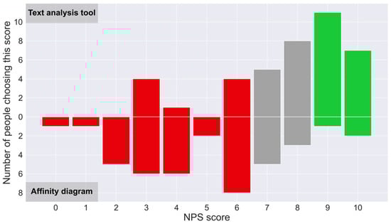 The NPS scores from the 40 participants indicate their general attitude toward the affinity diagram method and the automated classification tool. Figure 11 shows the distribution of these scores. For the affinity diagram method, the results were predominantly negative, with 29 participants being classified as detractors (scores 0–6), eight as passives (scores 7–8), and only three as promoters (scores 9–10), resulting in an NPS score of −65. This score reflects a general dissatisfaction among users with the traditional method. In contrast, the automated classification tool demonstrated a more positive reception. It had 9 detractors, 13 passives, and 18 promoters, leading to an NPS score of 23. This score indicates a favorable user attitude towards the tool, suggesting that it was more well received and likely to be recommended by users.