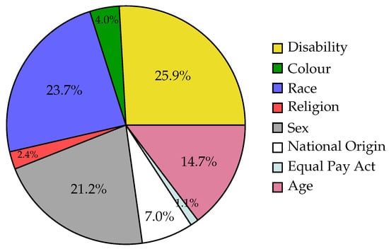 - Fenton, W. 2023 Employment Discrimination Statistics Employees Need to Know. Available online: https://www.wenzelfenton.com/blog/2022/07/18/employment-discrimination-statistics-employees-need-to-know/ (accessed on 20 November 2023).