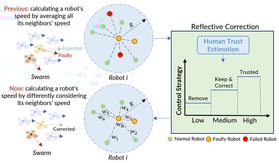 Previous research has also delved into fault detection and tolerance in robot swarms [27,28]. Inspired by the synchronized flashing behavior observed in fireflies, ref. [29] developed a general abnormality detection method to identify non-operational robots in a swarm by analyzing the different flashing frequencies of each robot’s onboard light-emitting diodes. However, this method required faulty robots to proactively report their fault status to the swarm for correction, leaving unreported issues unaddressed. Refs. [30,31] developed behavior-based approaches to distinguish normal from abnormal robots in a swarm, treating persistent and abundant behaviors as normal and rare behaviors as abnormal. Nevertheless, these methods have limitations when it comes to robots diagnosing higher-level faults without a holistic view, as well as coping with variations in tolerance to abnormal behaviors over time and in specific situations. In contrast, our paper investigates a fault detection method for robot swarms by developing a robot’s understanding of human trust. Through self-reflection of robot behaviors based on its estimation of human trust, Trust-R helps a swarm proactively correct its faulty behaviors.