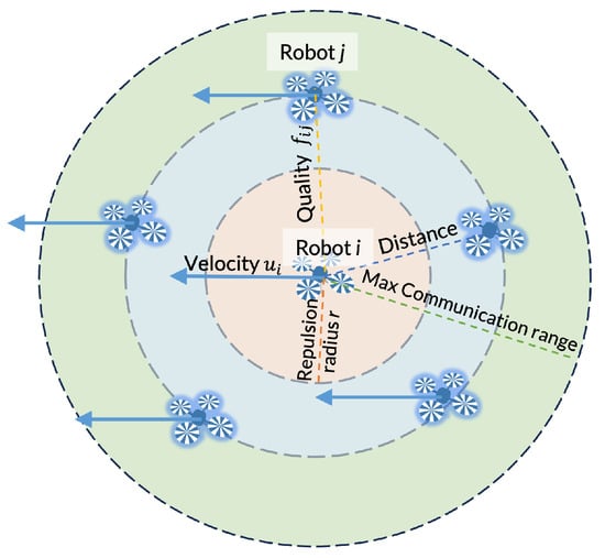 In the process of updating the status of robot i, the weights are computed by normalizing all the communication quality values within the communication range, as described in Equation (5). Specifically, when , the trust level of the robot itself is used, denoted as . Conversely, when , the communication quality between robots i and j is utilized, denoted as . It is important to note that holds true for all values of k.