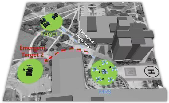 A robot swarm, comprising multiple homogeneous robots, autonomously coordinates itself through unified control laws to achieve collective behaviors such as aggregation, flocking, and navigation [1,2,3]. In contrast to a single robot, a robot swarm possesses an enhanced capability for task execution, owing to its multi-member characteristics and inherent resilience to failures. On the other hand, humans excel in tasks related to comprehension, plan adjustment, and risk management [4,5,6]. By integrating robot swarms with human operators, a collaborative human–swarm system can effectively perform complex and large-scale tasks, such as searching for victims in natural disasters [7,8], monitoring public areas [9,10], and tracking multiple ground targets [11,12]. These tasks are beyond the capabilities of single-robot systems due to the need for diversity in assistance, coverage of large areas, and tracking of numerous targets [13,14,15,16].