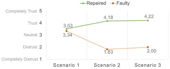 Figure 8 shows the results of the experiment under Scenario 3. The likelihood of participants reporting faults in both the faulty and repaired conditions exhibited a significant disparity in Scenario 3. Participants displayed a greater propensity to report faults in the faulty conditions compared to the repaired conditions (). The mean trust levels in the faulty and repaired conditions were 2 and 4.22, respectively. Furthermore, participants were more inclined to attribute higher trust levels to the repaired condition as opposed to the faulty condition ().