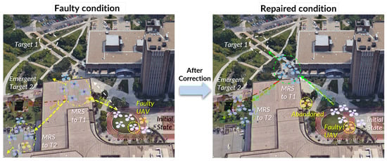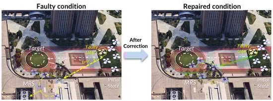Experiment results for Case Study III: emergent response. In the faulty condition, the UAV swarm performs a task in the presence of a faulty robot; while applying the Trust-R, the UAV swarm will restrict the influence of the faulty robot, which improves the performance of the UAV swarm.