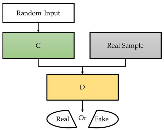 Generative adversarial networks, a brand-new generative model, were put forth by Goodfellow et al. [] in 2014. Generative adversarial networks engage in both a competitive and a cooperative process because they are made up of two neural networks: the discriminator (D) and the generator (G). While the discriminator seeks to distinguish between actual and synthetic data, the generator is tasked with creating synthetic data samples that resemble real data. Through this competitive training, generative adversarial networks gain knowledge from one another, causing the generator to produce more and more accurate data until it reaches an equilibrium where it is impossible to tell the difference between generated and genuine data. Figure 2 shows the process of generative adversarial networks.