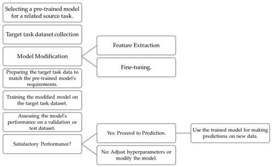 Choosing a basic model trained on a source task and then fine-tuning it with a smaller, task-specific dataset for the target task are typical steps in the process. Through this adaptation, the model can preserve its general knowledge while adapting its learned representations to the specifics of the current task. In the transfer learning process (Figure 3), a pre-trained model is chosen based on a related source task, and a target task dataset is collected and pre-processed accordingly. The model is then modified either through feature extraction, where new layers are added while keeping pre-trained layers frozen, or fine-tuning, where some pre-trained layers are unfrozen. The modified model is trained on the target task dataset, and its performance is evaluated on a separate dataset. If the performance is satisfactory, the trained model can be used for making predictions on new data. If not, adjustments such as hyperparameter tuning or model modifications can be made to improve performance. Once the desired performance is achieved, the transfer learning process is complete, and the model is ready for practical use in the target task.