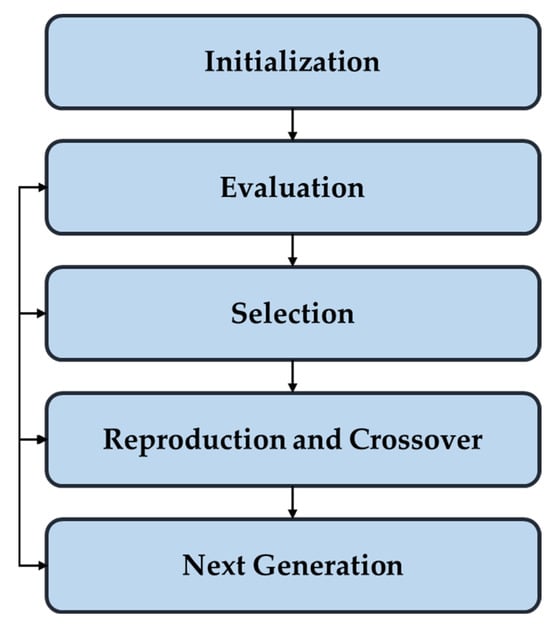 Artificial neural networks, or ANNs, are created using evolutionary methods by the AI branch known as neuroevolution. This approach uses evolutionary algorithms to train the neural networks. Even though we would think it has something to do with deep learning, neural evolution is not quite the same as what deep learning is at its core. As previously mentioned, neuroevolution is a method of machine learning that uses evolutionary algorithms to create artificial neural networks, drawing inspiration from the evolution of organic nervous systems in nature []. The process as shown in Figure 4 begins with initializing a population of neural networks with random parameters, representing potential solutions. These networks are then evaluated based on predefined metrics, determining their fitness for the given task. The top-performing networks are selected to proceed, mimicking natural selection. Through reproduction and crossover, new offspring with random changes and combined traits are generated. This process iterates for multiple generations, continuously refining and improving the neural networks’ performance.