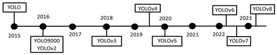 For real-time detection, integrated CNNs are used by researchers to enhance the detection performance of an algorithm. Continuous advancements in YOLO and SSD regression-based algorithms [] exist. The accuracy of these algorithms for multiscale targets and small objects is not high. Using a lightweight model is another hot issue in the target detection domain []. So, to reduce the number of network computations, Ren and Bao [] used MobileNet as a primary network, and standard convolution was replaced with inverse residual convolution in the SSD detection layer. Du et al. [] trained two neural networks for bullet hole detection, i.e., one is the original Faster-RCNN, and the second is the improved model based on Faster-RCNN. The experiment showed that their improved model (based on Faster-RCNN) performed better than the original Faster-RCNN by enhancing the average precision by 20.3%. That study was published in the year 2019, and since then, there has been significant development in object detection algorithms. Different versions of the YOLO model have been released to balance speed and accuracy in the detection process; among them, YOLOv5 is the most popular model. It gained popularity because of its performance in terms of accuracy and speed. However, few studies used YOLOv5 and improvised its design by comparing it with the original model [,,]. With better inference time and accuracy, YOLOv6 was introduced, followed by YOLOv7 during the same year. The YOLOv6 model’s performance and real-time capabilities were evaluated by a study [] in which fire detection in Korea was carried out. The most recent addition to the YOLO family is YOLOv8, which was released in 2023. Figure 2 shows the development of YOLO over the years.