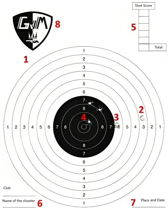 The initial data for the paper were collected from shooters at a shooting range in Haarlem, the Netherlands. The dataset comprises ten unique cards, each of which is 26 by 26 cm in size and has ten different rings. These rings are assigned a score value ranging from 1 to 10, with a value of 0 assigned for a missed shot. If a shooter shoots inside the 7-ring but breaks the 8-ring’s line, a score of 8 is given for that shot. Similarly, if a shooter shoots the same bullet hole, the same score is assigned for that shot. Figure 3 shows an example of the shooting card obtained from the shooting range with annotations to provide a clear understanding of the various elements of the card.