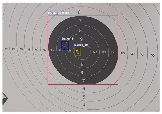 An example of annotations is shown in Figure 5. Every bullet has a different class concerning the score. Figure 5 shows an edge case when a bullet hole touches the boundary. The hole appears to be more in ring eight than in ring nine. In the dataset, this is annotated as a nine. This is because corners of the bullet hole cross into ring nine, which means the advantage could be given to the shooter.