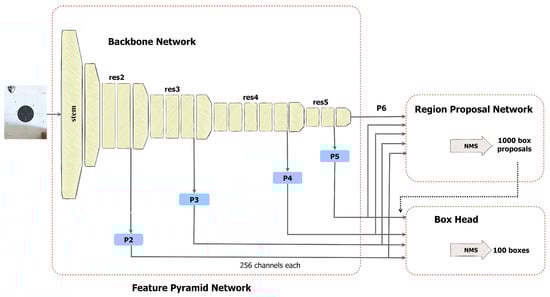 The neck component, implemented as the feature pyramid network (FPN), refines the feature maps obtained from the backbone. The FPN combines features from different scales to create a multiscale feature pyramid, enabling the detection of objects at various sizes and scales within the image. Feature pyramids are a fundamental element in recognition systems that enable the detection of objects at multiple scales []. However, specific modern deep learning-based object detectors, like YOLO, do not contain this part and are called single-shot detectors.