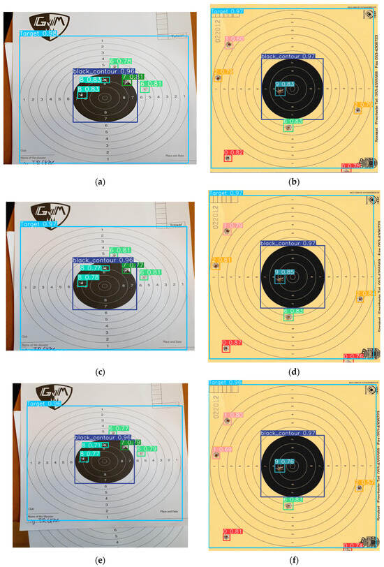 Results of bullet hole detection by YOLOv8 models: (a) performance of YOLOv8n on test image-1; (b) performance of YOLOv8n on test image-2; (c) performance of YOLOv8s on test image-1; (d) performance of YOLOv8s on test image-2; (e) performance of YOLOv8m on test image-1; (f) performance of YOLOv8m on test image-2.