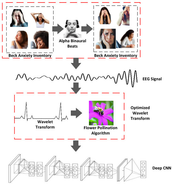 Figure 1 shows a block diagram for proposed EEG signal processing based on a deep CNN with optimized wavelet transform, in which a raw EEG signal is transformed into a wavelet parameter and is analyzed in time–frequency space. Then, by integrating the flower pollination algorithm, the optimized wavelet parameters are obtained without artifacts in EEG signals, and the deep CNN is then used to extract features and classify the various levels of anxiety in the extracted signal.