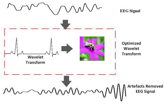 Figure 2 illustrates the conceptual diagram of an optimized wavelet transform using the flower pollination algorithm, in which the contaminated EEG signal is expanded using an optimized wavelet transform to obtain optimized wavelet coefficients, and then the wavelet transform is integrated with the flower pollination optimization algorithm to select the best wavelet parameters that remove the most artifacts from the EEG signal.