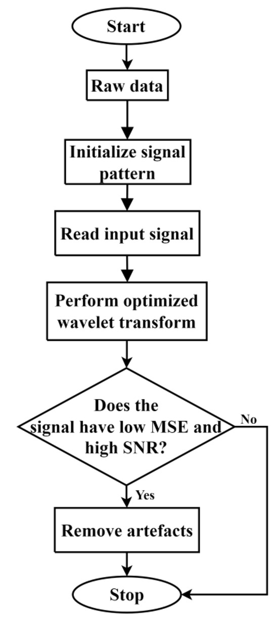 Figure 3 depicts the flow diagram of an optimal wavelet transform, which begins with the signal’s initialization pattern for data collection. The input signal data is read first, then an efficient wavelet transform is performed for each signal to choose the best wavelet parameters. A greater signal-to-noise ratio (SNR) and a lower mean square error (MSE) are considered to be the objective functions for addressing optimization problems that remove artifacts from the EEG signal.