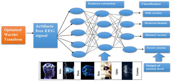 Figure 4 shows the deep CNN-based signal processing’s feature extraction and classification, in which five features were extracted from the artifacts-free EEG signal, which was the alpha, beta, theta, delta, and gamma time and frequency domains in brainwaves. Therefore, this model predicts the anxiety level of each feature by using a non-linear activation function in its classification.