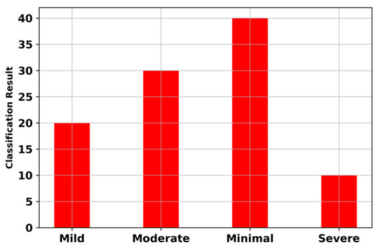 Figure 7 shows the classification results of the proposed system for the level of anxiety. The classification results show a mild level of anxiety in 20 cases, moderate anxiety in 30, minimal anxiety in40, and severe anxiety in 10, based on the EEG signal processing of brainwaves.