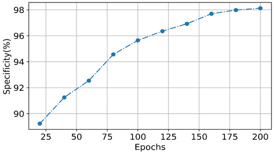 Figure 14 depicts the specificity of the proposed system with varying numbers of epochs. The specificity has a minimum value of about 85 in epoch 23 and a maximum value of about 98 at the specificity of about 200 epochs. The specificity of the proposed system is determined using the flower pollination optimization algorithm.