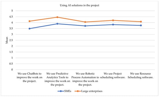 Figure 1 shows the mean values of AI adoption in SMEs and large enterprises. This plot provides a visual comparison of how AI technologies are adopted in various aspects of project management and strategy in SMEs versus large enterprises. Each line in the plot presents the mean values for a specific enterprise type across different statements, allowing for a direct comparison between SMEs and large enterprises in their approach to adopting AI technologies. Table 4 presents descriptive statistics and the results of the Mann–Whitney U Test for the construct “using AI solutions in the project”.