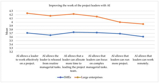 Figure 2 shows the comparison of AI solution usage in SMEs and large enterprises. The x-axis presents statements about the use of AI solutions in project, while the y-axis shows the mean values for SMEs and large enterprises. Each line in the plot presents the mean values for a specific enterprise type across different AI solutions. Following this, Table 5 shows descriptive statistics and the results of the Mann–Whitney U test for the construct “improving the work of the project leaders with AI”.