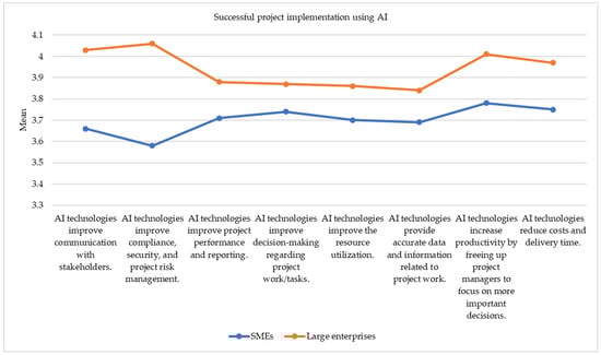 Figure 3 shows the mean values of improving the work of the project leaders with AI between SMEs and large enterprises. Moreover, Table 6 shows descriptive statistics and the results of the Mann–Whitney U test for the construct “successful project implementation using AI”.
