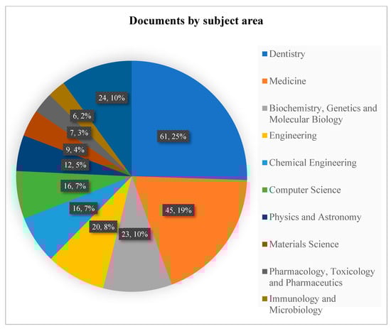 The greatest number of searched articles (n = 36) was published in 2022, whereas the smallest number (n = 8) was published in 2018. More than a quarter of all documents (25.5%) were published with a primary focus on dentistry, followed by medicine (18.8%), biochemistry, genetics and molecular biology (9.6%), engineering and chemical engineering (8.4% and 6.7%, respectively) and computer science (6.7%). The subject matter of the remaining fifty-eight documents varied from social sciences to material science. The largest proportion of searched documents (64.7%, n = 86) were articles, followed by reviews (31.6%, n = 42).