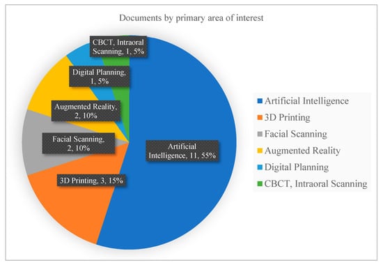 Figure 4 depicts the proportion of the primary areas of interest of the top twenty articles ranked by FWCI values. More than half (n = 11) of the selected articles focused on artificial intelligence, while three articles studied or reviewed 3D printing and its application in orthodontics, two articles researched facial scanning, two articles were devoted to augmented reality, one article focused on digital planning in orthodontics and one article was about merging CBCT with intraoral scans.