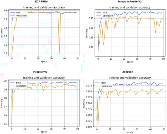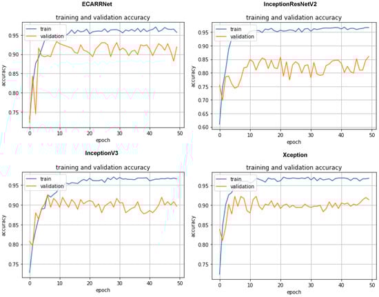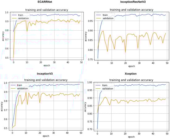 In Figure 9, the accuracy curves of the models based on the full dataset are displayed which includes defective and non-defective images from both fastener and rail. Once again, we see our ECARRNet model outperforming the other transfer learning models. InceptionV3 and Xception produce results that are comparable to ECARRNet while InceptionResNetV2 performs very poorly on the full dataset.