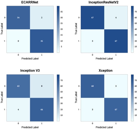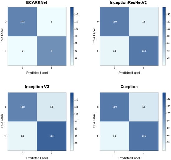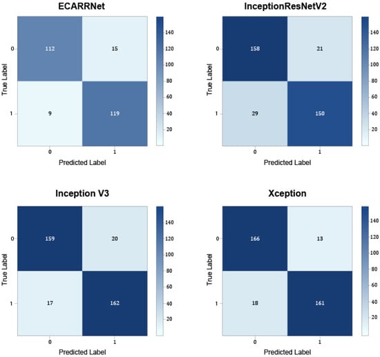 Figure 10 shows the confusion matrices for the models on the full dataset containing defective and non-defective images from both fastener and rail. The results show that ECARRNet produces fewer false positives compared to InceptionV3 and produces similar and comparative results when compared to InceptionResnetV2 and Xception respectively.