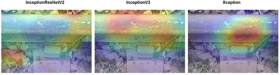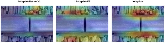 Figure 5 portrays the Grad-CAM visualizations for the same image selected randomly from the rail dataset for the compared models. The region of the heatmap generated using the InceptionResnetV2 model classifies the incorrect region in the image where there is no fault, as the red region which represents the highest contribution of the model for classification is not in the defective portion of the track. InceptionV3 and Xception, on the other hand, produce heatmaps that comparatively fall much closer to the region of faulty rail tracks.