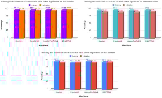 Figure 13 demonstrates the accuracy values in percentage for three different versions of the datasets. For each dataset, it compares the performance of our proposed model, ECARRNet with Xception, InceptionV3, and InceptionResNetV2, these models have also shown great results in image classification use cases. It also shows accuracy values for training and validation or test sets which clearly distinguishes the performances of ECARRNet from other models. We are considering the test or validation accuracy here for comparison because we have ensured that the test/validation set does not have any labels for each image. We have just provided the images to the models to predict the classes. Therefore we can see that validation accuracy is the highest for all 3 versions of the dataset for our proposed model ECARRNet, compared to other SOTA models for predicting faults in railway tracks. Also, by comparing results from Table 2, Table 3 and Table 4 we can also say that ECARRNet has shown expected results in other metrics like—precision, recall, F1 score, and in support as well. This means our proposed model is performing really well in predicting and distinguishing defective and non-defective railway tracks which once again proves its superiority against other popular CNN-based architectures for railway fault detection.