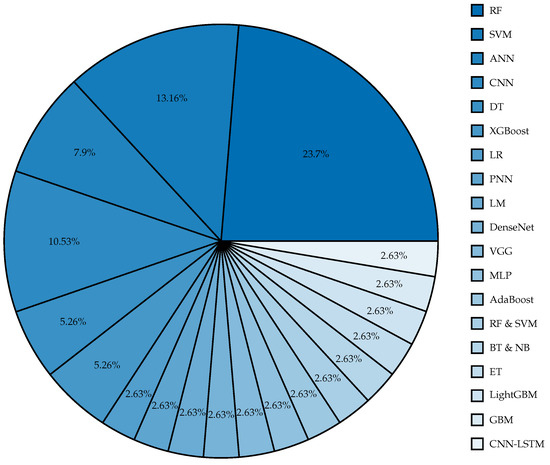 From the summary tables of the reviewed literature, Table 1, Table 2 and Table 3, numerous pivotal insights have been discerned. The RF algorithm is established as a widely employed and effective method, as evidenced by studies [9,10,11,15,18,19,22,24,33], denoting its robust utility during pregnancy and labor stages. However, avenues for advancement are noticeable within the domains of DT and SVM, particularly when SVMs have not exceeded a 94% accuracy benchmark in research [12,14,16,17,21]. This suggests room for further methodological enhancement. Concurrently, DL methodologies, including ANN, CNN, and MLP, have delivered promising results in classifying fetal hypoxia cases. Nonetheless, the prevalent reliance on a single dataset in studies [25,26,27,28] highlights a significant research gap, underscoring the imperative of employing more diverse datasets to substantiate these models’ validity. In the context of ensemble techniques, especially Gradient Boosting (GB) models, studies [41,43,44,45] have yielded outstanding results. Yet, the repeated use of similar datasets, with study [44] being an exception as it utilized a unique private dataset, raises concerns about the diversity of datasets. Notably, the incorporation of base models, often regarded as suboptimal, into ensemble methods for improved predictive accuracy, as shown in study [17], embodies an innovative and progressive stance in the field. Despite significant advancements and accuracy rates in various studies, the homogeneity of datasets employed across different models constrains the generalizability of these insights, thereby highlighting the need for future research to focus on diversifying datasets, investigating novel ML and DL models, and refining extant methodologies. The need for comprehensive and varied data collection is a recurrent theme, with many studies limited by the range and diversity of their datasets, leading to potential biases or model overfitting. Collaborative endeavors with healthcare providers to gather more inclusive and representative data are posited as a viable solution to mitigate this constraint. Figure 3 shows the proportion of models that were used in the reviewed papers, while Figure 4 shows the number of samples used for each technique.