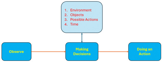 Intention is an action or emotion where a person does something planned or deliberately [20]. In our daily lives, sometimes we do something habitually or follow a plan. In this work, we tried to visualize the intention based on the existing definition by dividing the definition into three parts, as shown in Figure 2. As Figure 2 illustrates, when we do something or take an action, first we observe and then make a decision based on the “Environment”, “Objects”, “Possible Actions”, “Time”, and finally we do the action based on our decision.