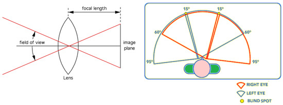 According to [22] we should be able to see around 60 degrees nasally (toward your nose) and about 95 degrees temporally (toward your ear) from the center of an ocular. We should also be able to see 60 degrees above and 75 degrees below. This indicates that at any one moment, each eye provides a 155-degree horizontal field range and a 135-degree vertical field range. Figure 3 shows the field of view of an eye.