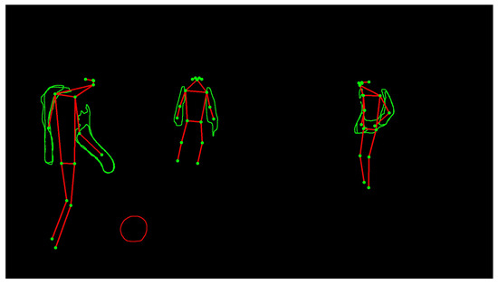 After defining the intention, we extracted the polygons of the objects of two classes. To determine the hand and touches, we extracted the hand and ball objects polygons, then we examined each polygon through iteration, calculating the normal for each edge. Subsequently, this normal is employed to project the vertices of both polygons onto a common axis. If the projected intervals show no overlap, indicating no intersection between the polygons, the function returns False. Conversely, if there is an overlap on all axes, signifying an intersection, the function returns True. Which means the two objects overlapped each other. Figure 7 represents the skeletons of the players and the red circle is the ball objects polygon whereas green polygons represent the hands or arms of the players.