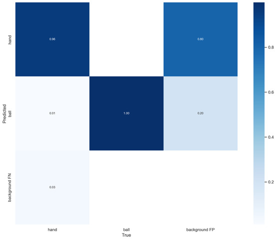Hand detection achieved an accuracy of approximately 97% and 96% in training and testing respectively. The ball detection achieved 100% accuracy in both situations. The test results’ confusion matrix is displayed in Figure 9. Additionally, it was discovered that the instance segmentation outcomes during training were adequate. The accuracy of a Fast R-CNN object detection model is shown in Figure 10, demonstrating the beneficial effects of longer training times and more data on accuracy.
