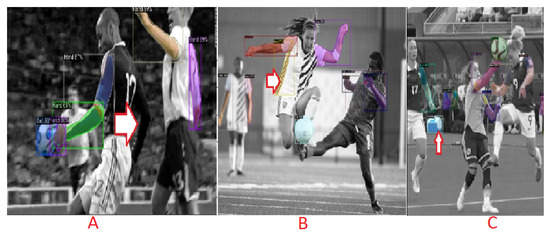 Figure 12 displays instances of low accuracy results, such as failure to recognize a player’s hand (situation A) and false positives where a body part is misclassified as a hand (situation B) and a bag is identified as a ball (situation C) [6].