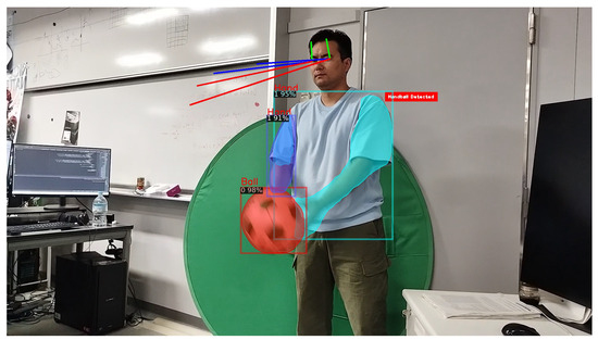 Object detection training for hand and ball was previously conducted [6] and, in this paper, we extended to train the eye gaze directions and intention definition. The object detection training was implemented with fewer images thus there were some mistakes and lower accuracy. Whereas in the intention definition, if the eyes were not visible or distanced from the camera, then the results could not be determined whether the player was focused or not. Thus, camera calibration and objects were very important to determine the overall results. We used synthesized data to avoid copyright issues. In addition, in this model, the synthesized data comes with direction levels and annotations. A novel approach for efficiently generating extensive sets of diverse eye region images for use as training data. Handball recognition speed is not calculated, but the system operates in real-time (30 fps). Gaze directions are one important factor in determining handball events in a game. However, if the player’s eyes are obstructed from view due to factors such as other players, the ball, or body parts, the system may fail to recognize the event even if the player intentionally touches the ball. Moreover, environmental conditions like snow, darkness, or rain can further impede visibility, potentially leading to unexpected outcomes due to obscured views of the player’s eyes. In addition, in this study, a single camera was employed. Therefore, the method’s effectiveness may be compromised if objects are obstructed from view. Despite this limitation, our findings indicated that the method remains effective when all necessary objects are visible, yielding satisfactory results. Therefore, in future endeavors, we aim to explore the utilization of multiple cameras to enhance the detection of handball events during football matches.