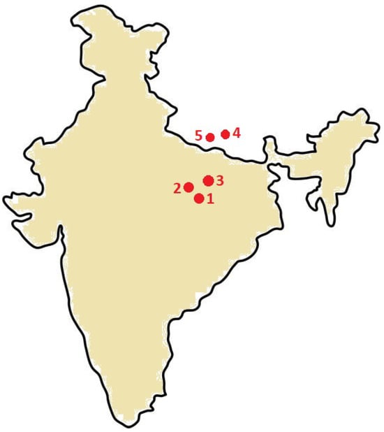 Centres for dataset collection. The dataset was collected at two centers in Jharkhand state (1 and 2), one center (mill) in Bihar state (3), and two centers in the country of Nepal (4 and 5). These centers were either procurement centers or rice mills.