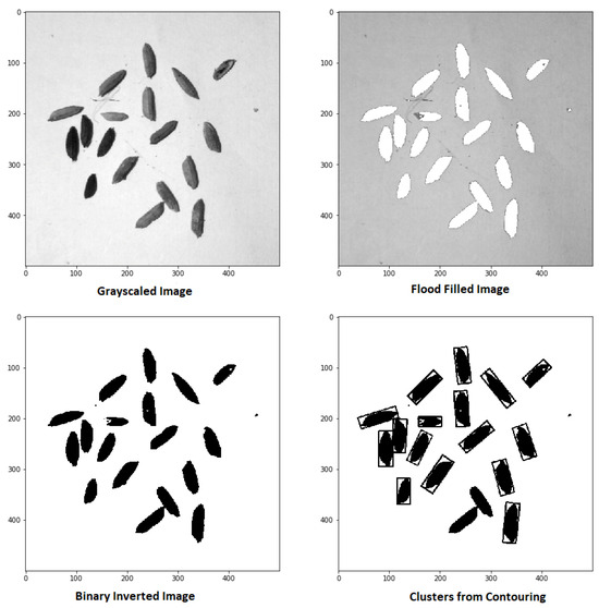 After noise removal, four specific processes using image processing techniques are used, as shown in Figure 5. The main motivation of image processing is to find the region of interest and the difference in the color of the grains. For finding the region of interest, contouring is used along with grayscale conversion, flood filling, and inversion; for the color analysis, a grayscale image is taken as input. These processes are the standard processes defined in the opencv library.