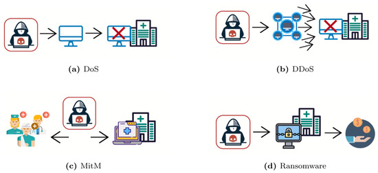This section briefly elaborates on sample types of IoMT attacks. In data modification attacks, the attacker aims to tamper with the data, which compromises their integrity. An attacker tries to impersonate real users in a spoofing attack, which violates the authenticity aspect of security. Social engineering attacks are also very common nowadays. Attackers attempt to trick victims into sharing personal information. This violates data confidentiality because the system’s sensitive data can be revealed. DoS attacks occur when the system becomes overwhelmed by network traffic so that the service may be unreachable or slow. The system’s availability is affected by DoS attacks. Distributed Denial of Service (DDoS) attacks involve multiple sources overwhelming a system with traffic, which also results in unavailability, as in DoS attacks. In MITM attacks, the attacker can intercept communication channels within the network. This attack can compromise the confidentiality aspect if the attacker steals the data. It can also affect the integrity of the data, if the attacker modifies them before forwarding them to the recipient. A malware, or malicious software, attack is a common cyberattack that executes unauthorized actions on the victim’s system. Viruses and worms are examples of malware attacks. The attacker aims to corrupt or steal the data (integrity violation). The intruder can also illicitly access the system (violating the confidentiality rule). Ransomware is a type of malware that encrypts data and demands a ransom for their release, compromising data availability and potentially confidentiality if the data are sensitive. Figure 1 illustrates examples of the mentioned security threats [1].
