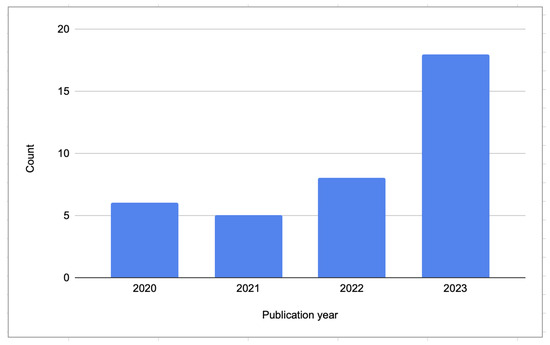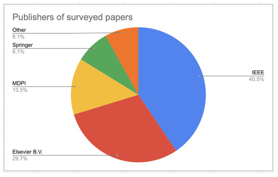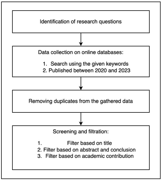 This section outlines the methodology that was used in conducting this survey. The main objective was to enhance the security of IoMT systems in order to protect them from cyberattacks. The research analyzed relevant scholarly articles on the cybersecurity of IoMT systems that use artificial intelligence (AI) techniques. The articles included were published during the last four years, up to the year 2023. The original research questions are presented in Table 1. The first phase of data collection included searching several academic databases, including Google Scholar, Scopus, and IEEE Xplore, using specific keywords like “cybersecurity”, “IoMT”, “healthcare”, “ecosystems”, “artificial intelligence”, “machine learning”, and “deep learning” to identify relevant publications. The collected data were then examined and refined to determine their relevance to the survey’s purpose. The filtering procedure consisted of three steps, first based on the title, followed by an evaluation of the abstract and the conclusion. Ultimately, the filtration process was conducted according to the scholarly contributions. Figure 2 depicts the technique that has been used for the proposed review. In summary, this study examined a total of 33 research studies and 4 survey papers. The pie chart in Figure 3 illustrates the distribution of articles chosen from various types of journals. The bar chart in Figure 4 displays the publication years of the works considered in this study.