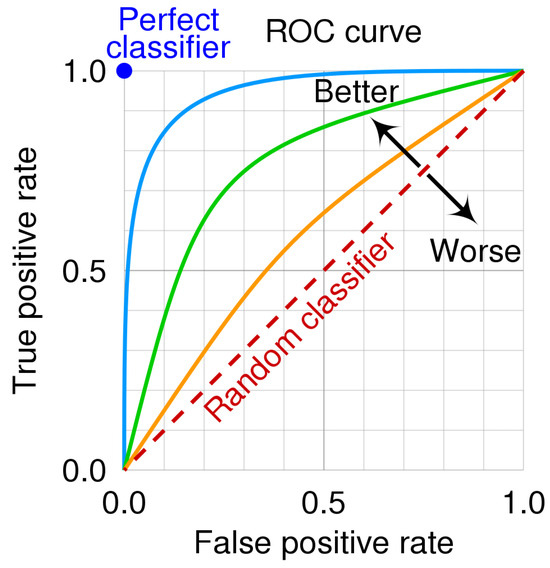 - ROC Curve Image. Available online: https://en.wikipedia.org/wiki/File:Roc_curve.svg (accessed on 11 May 2024).
