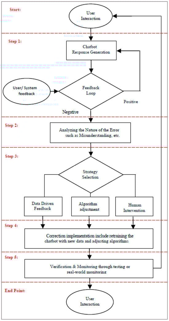 Error correction is an important component of chatbots that shapes their efficacy and reliability. This includes enhancing the chatbot’s learning capabilities, adaptability, and accuracy. ML models, trained on extensive datasets, are designed to identify patterns, make decisions, and predict outcomes. Despite their sophistication, these models are prone to errors due to factors such as biases in training data, overfitting, underfitting, or the complexity of tasks [12,13]. Error correction involves identifying these inaccuracies and refining the model for improved functionality. In the context of chatbots, inaccurate models not only impact performance but also pose the risk of a loss of credibility, particularly in critical sectors like healthcare and finance where errors can have grave consequences [14].