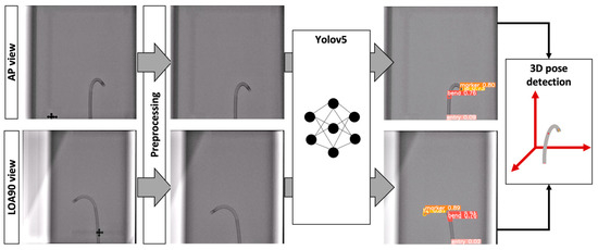 In this section, we elaborate on a step-by-step methodology (with a schematic view presented in Figure 1 for detecting 4 landmark points of the catheter using bounding boxes to extract the catheter’s 3D pose). This section will discuss data collection, preprocessing, Yolov5 deep neural network for bounding box detection, and postprocessing for 3D pose detection.