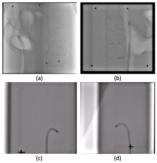 The second dataset consisted of 900 fluoroscopic images without the 3D-printed heart and metal spray-painted spine, which was created to enable the assessment of the 3D coordinate generation of the catheter and to generalize the dataset, generating diverse images, since these features may or may not be present in clinical images. This sample set was gathered using the custom-built setup shown in Figure 2.